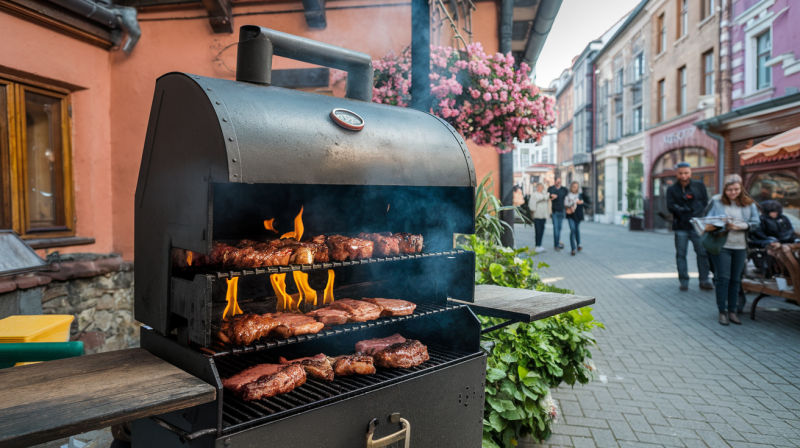 - Функциональность. Часто устанавливают термометр для контроля температуры в камере, регулировку тяги, поддон для сбора жира. Важно, чтобы конструкцию было легко очищать от разных загрязнений.