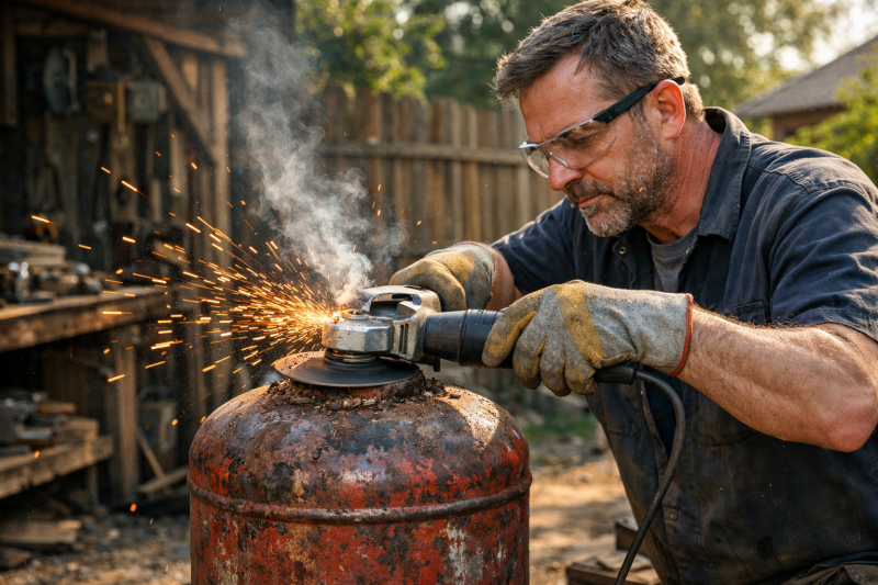 Это самый ответственный этап. Пренебрежение им чревато не просто неудачей, а реальной опасностью взрыва. Остатки сжиженного газа в замкнутом объеме при резке болгаркой мгновенно превращаются в бомбу. Следуйте инструкции.Выбор и подготовка газового баллона