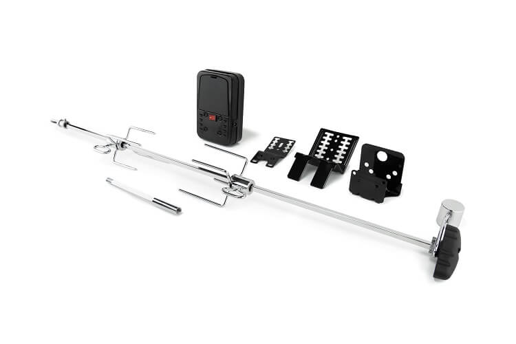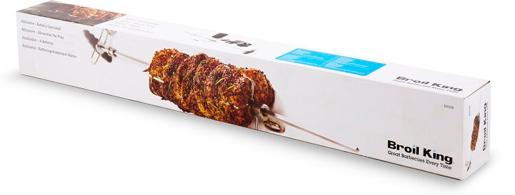 Электрический вертел для для газовых грилей Broil King. Универсальный вертел, с основной длиной 85 см, и специальной насадкой для увеличения 15 см. В комплекте противовес, вилки, мотор на батарейках. Питание от 2-х батареек типа D. Размеры: 85 x 8 x 8 cм (плюс удлиннитель 15 см). Вес: 2,15 кг.