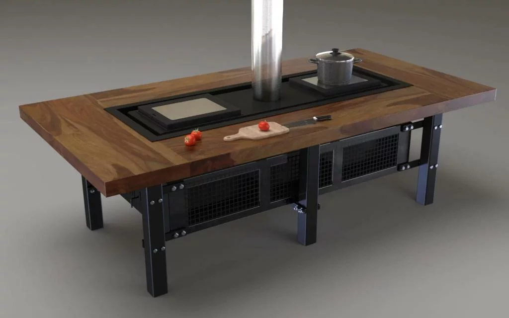 Стол выполнен из ламелей лиственницы высшего сорта, BBQ – из жаропрочного металла, имеет двойную стенку печи, зольники и колосники с двух сторон, и жаропрочное стекло robax (возможное исполнение стола из натурального камня). Дверки на гриль-столе могут открываться на 180 градусов и в огневое отверстие дополнительно устанавливаться гриль-решетка.