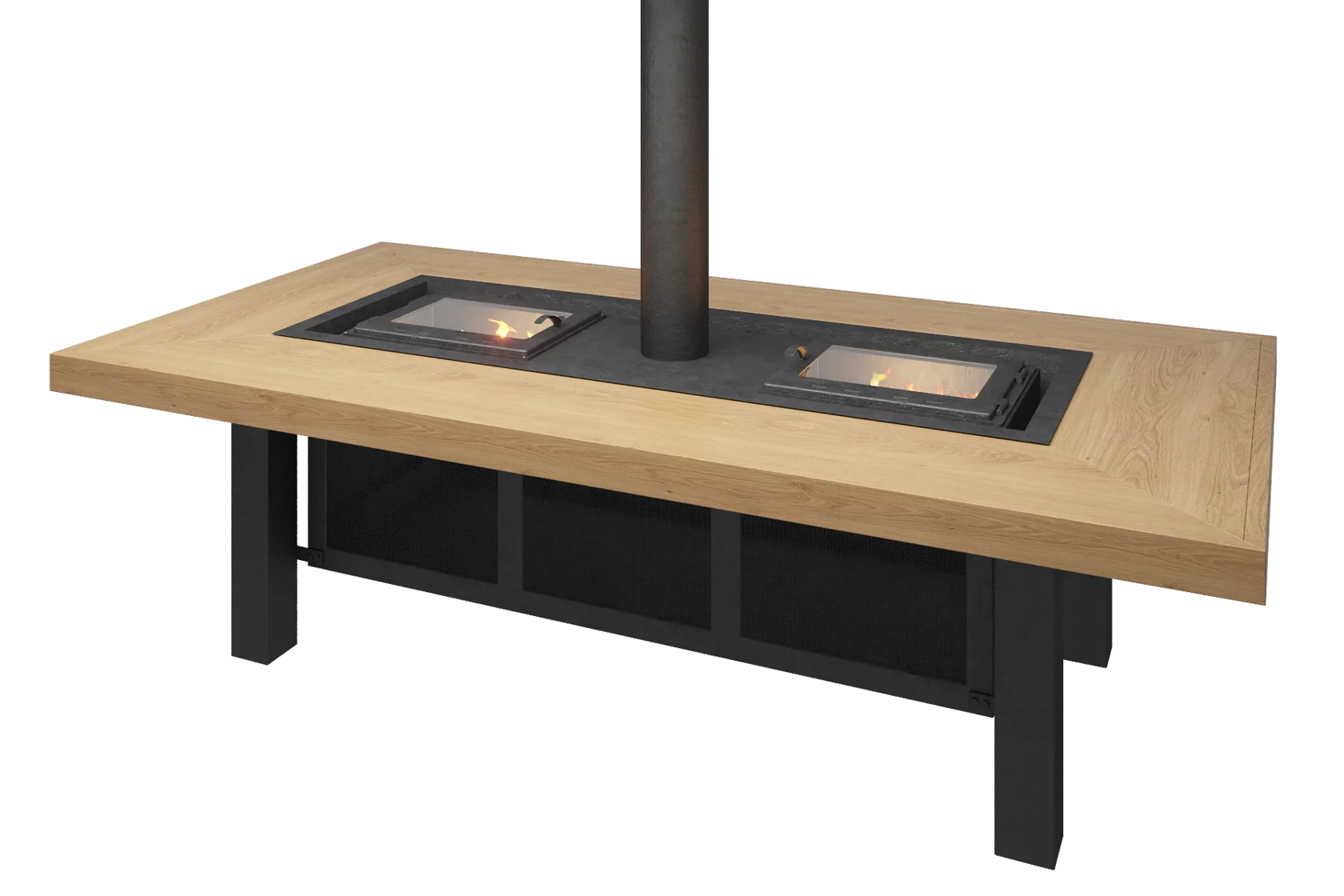 Стол выполнен из ламелей лиственницы высшего сорта, BBQ – из жаропрочного металла, имеет двойную стенку печи, зольники и колосники с двух сторон, и жаропрочное стекло robax (возможное исполнение стола из натурального камня). Дверки на гриль-столе могут открываться на 180 градусов и в огневое отверстие дополнительно устанавливаться гриль-решетка.