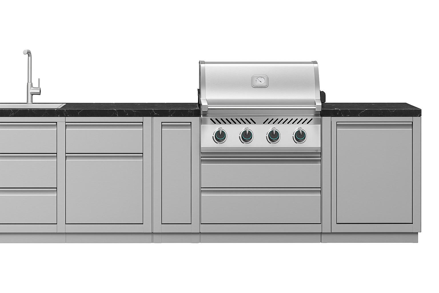 Летняя кухня состоит из модулей, при желании, модули можно наращивать на любую интересующую Вас длину. Все модули включая гриль выполнены из нержавеющей стали. Столешница не входит в комплект, а изготавливается по Вашему индивидуальному заказу под любую длину, цветовую гамму и материал. Кухня не требует грязных строительных работ, долговечная, функциональная и очень стильная. Она без сомнения украсит любую зону отдыха.