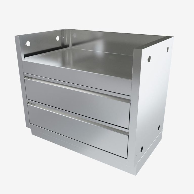 Оснащена двумя выдвижными ящиками с доводчиками, в которых можно хранить посуду, специи и аксессуары для гриля, а так же специальными отверстиями для газового шланга и электрического кабеля.