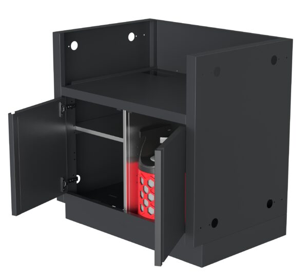 - Левая часть тумбы имеет сплошную полку и служит для хранения инвентаря и принадлежностей.