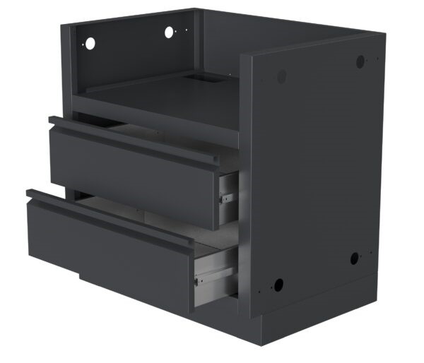 Тумба-основание предназначена для размещения в ней встраиваемого гриля Broil King Baron 520 Bi. Она может использоваться как в составе кухни, так и отдельно от нее. Тумба изготовлена из нержавеющей стали марки aisi304 толщиной 0.8 мм, которая имеет повышенную стойкость к коррозии. Это позволяет эксплуатировать тумбу на открытом воздухе круглогодично, поскольку такая сталь не подвергается ржавению ни во влажной среде, ни при попадании на нее снега или дождя. Тумбу в составе кухни, как правило, располагают в открытой беседке, на веранде, на террасе, под навесом или просто на открытой площадке. Благодаря четырем регулируемым опорам, тумбу легко установить по уровню на полу, выполненному из любого материала. Конструкция тумбы не требует сборки, и легко может быть смонтирована на месте. Боковые стенки тумбы имеют технологические отверстия: для прокладки внутри кухни коммуникаций, таких как газовые шланги, электрические провода, водопроводные и канализационные трубы и прочее. Также имеются отверстия для сбалчивания тумбы с соседними модулями для предания кухонному фронту жесткости и прямолинейности фасада. В верхней части тумбы размещены отверстия для закрепления к ней столешницы. Для хранения принадлежностей, используемых для работы на газовом гриле, в тумбе предусмотрены два выдвижных ящика. В них так же можно хранить кухонную утварь и приборы, упакованные продукты и многое другое. Выдвижные механизмы ящиков марки PULS (Китай) снабжены доводчиками, которые обеспечивают плавность закрывания ящика при несильном толчке. Ручки ящиков интегрированы в их фасады, что делает тумбу эргономичной при использовании, так как на фасадах нет выпирающих классических накладных ручек.