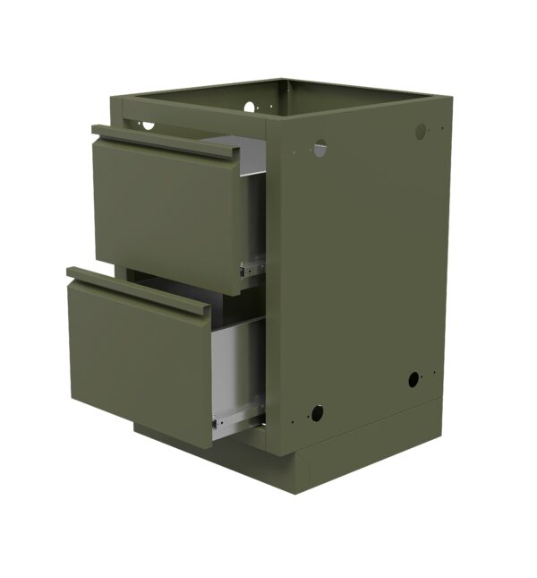 Универсальная тумба с двумя выдвижными ящиками дополнит вашу всесезонную кухню и обеспечит вас вместительными зонами хранения, в которых можно разместить, например, посуду, аксессуары для гриля или специи. Тумба может использоваться как в составе кухни, так и отдельно от нее. Тумба изготовлена из высококачественной пищевой нержавеющей стали AISI304. Нержавеющая сталь имеет повышенную стойкость к коррозии, что позволяет использовать тумбу круглогодично на открытых площадках, поскольку такая сталь не подвергается ржавению ни во влажной среде, ни при попадании на нее снега или дождя. Тумбу в составе кухни, как правило, располагают в открытой беседке, на веранде, на террассе, под навесом или просто на открытой площадке. Конструкция тумбы не требует сборки, и легко может быть смонтирована на месте. Боковые стенки тумбы имеют технологические отверстия для сбалчивания тумбы с соседними модулями для предания кухонному фронту жесткости и прямолинейности фасада. В верхней части тумбы размещены отверстия для закрепления к ней столешницы. Регулировка тумбы по высоте предусмотрена четырьмя ножками, за счет чего могут быть компенсированы неровности поверхности и выполнена установка по уровню на полу из любого материала. Выдвижные механизмы ящиков марки PULS (Китай) снабжены доводчиками, которые обеспечивают плавность закрывания ящика при несильном толчке. Ручки ящиков интегрированы в их фасады, что делает тумбу эргономичной при использовании, так как на фасадах нет выпирающих классических накладных ручек.