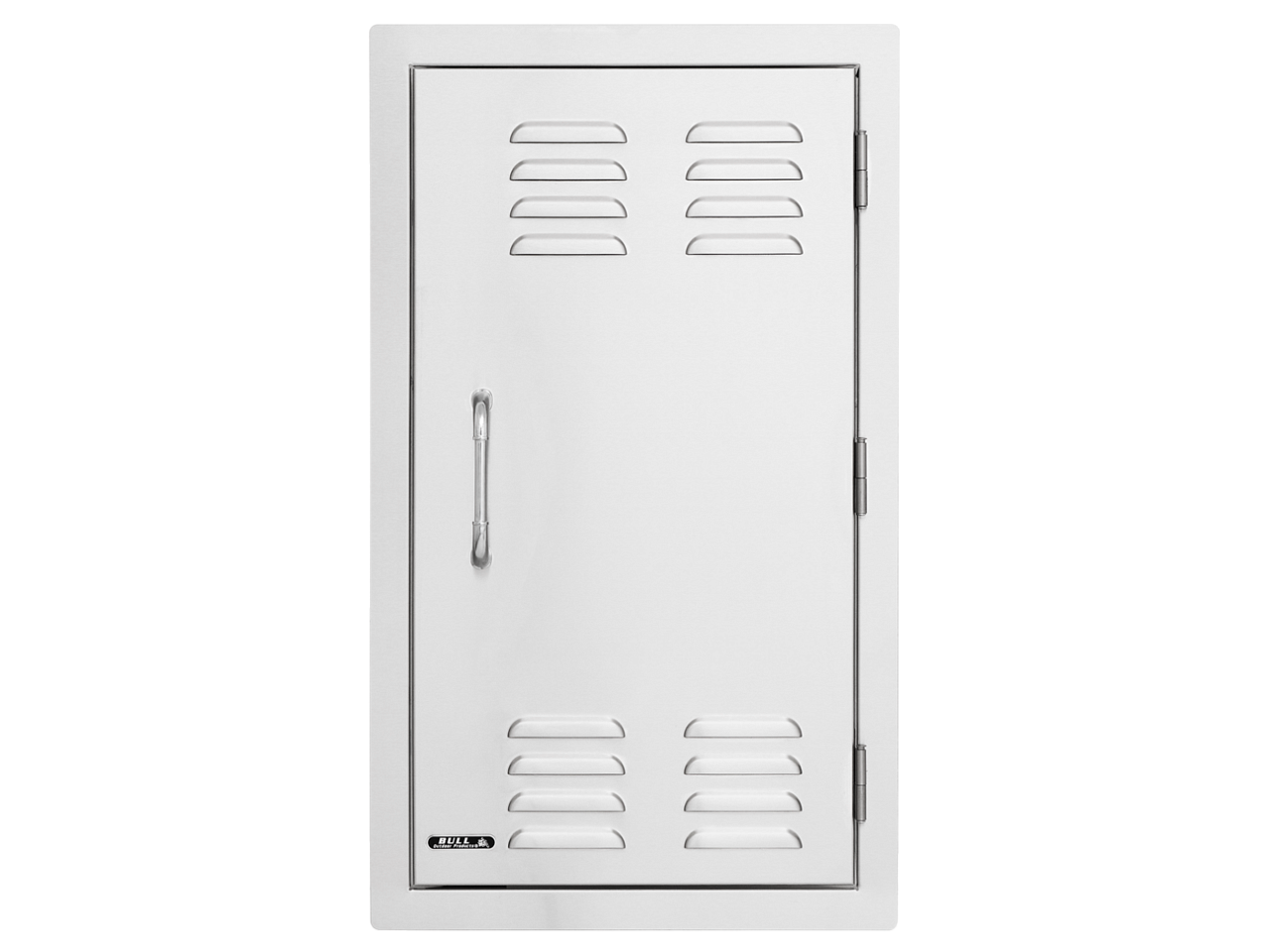 В центре двери расположена вертикальная ручка серебристого цвета. В верхней и нижней частях двери находятся по три горизонтальных прорези овальной формы, которые, вероятно, предназначены для вентиляции. Дверь имеет прямоугольную форму и обрамлена тонкой черной рамкой. В нижнем левом углу двери находится логотип или надпись черного цвета. Дверь выглядит прочной и предназначенной для использования в промышленных или складских помещениях.