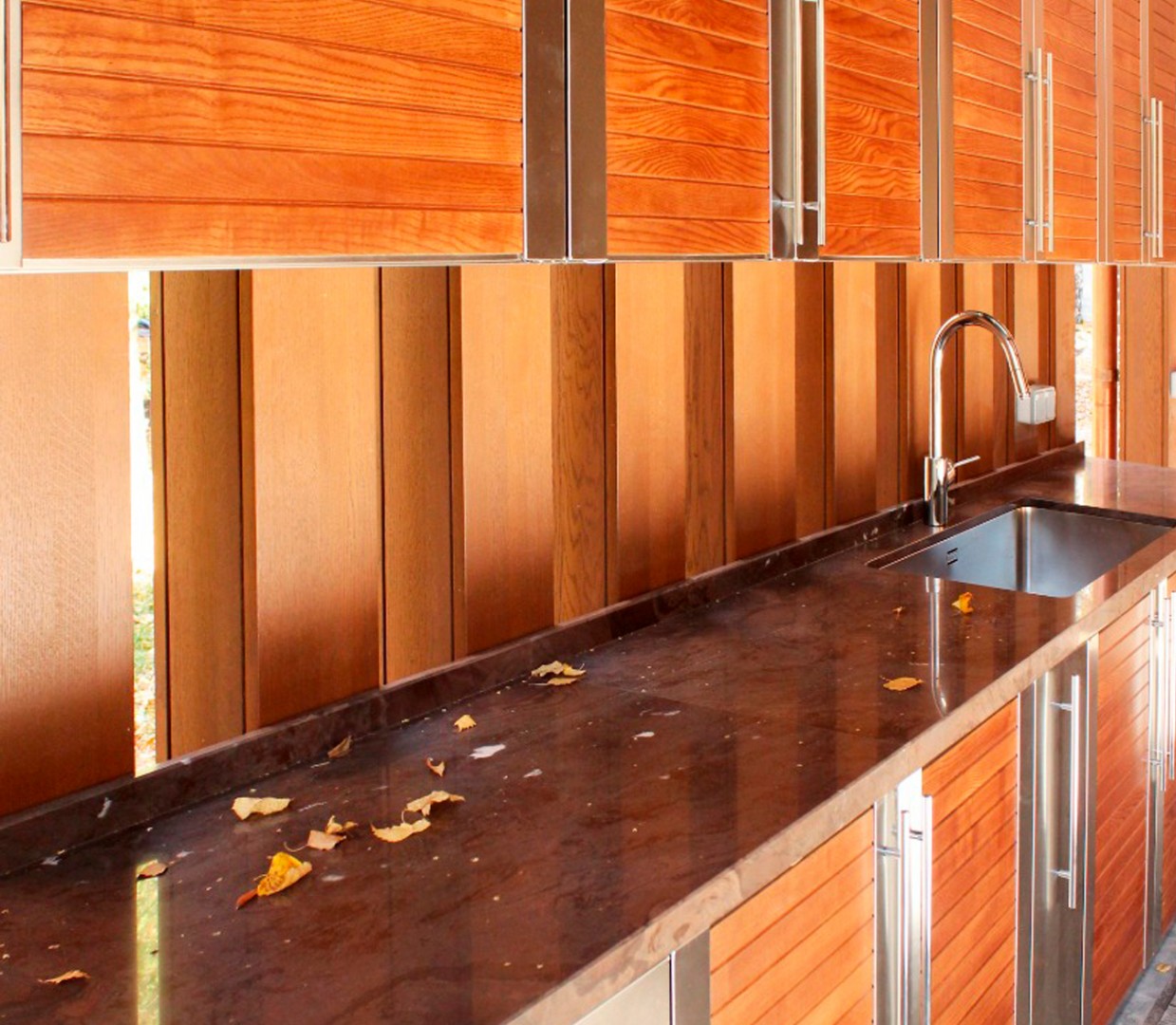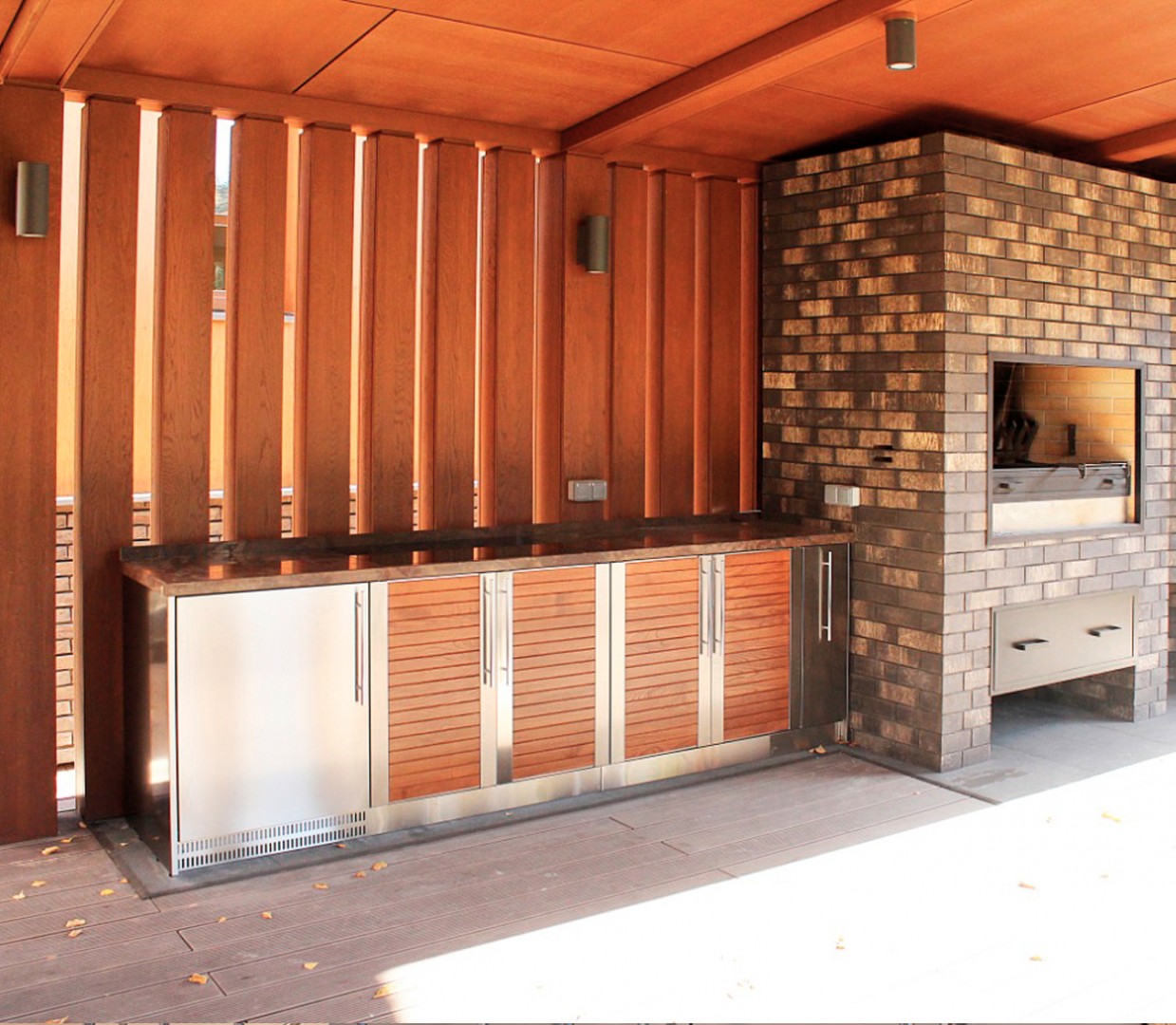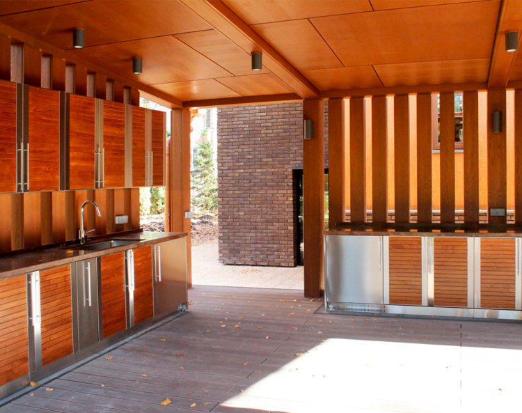Зона барбекю на террасе с фасадами с деревянными вставками состоит из двух частей.