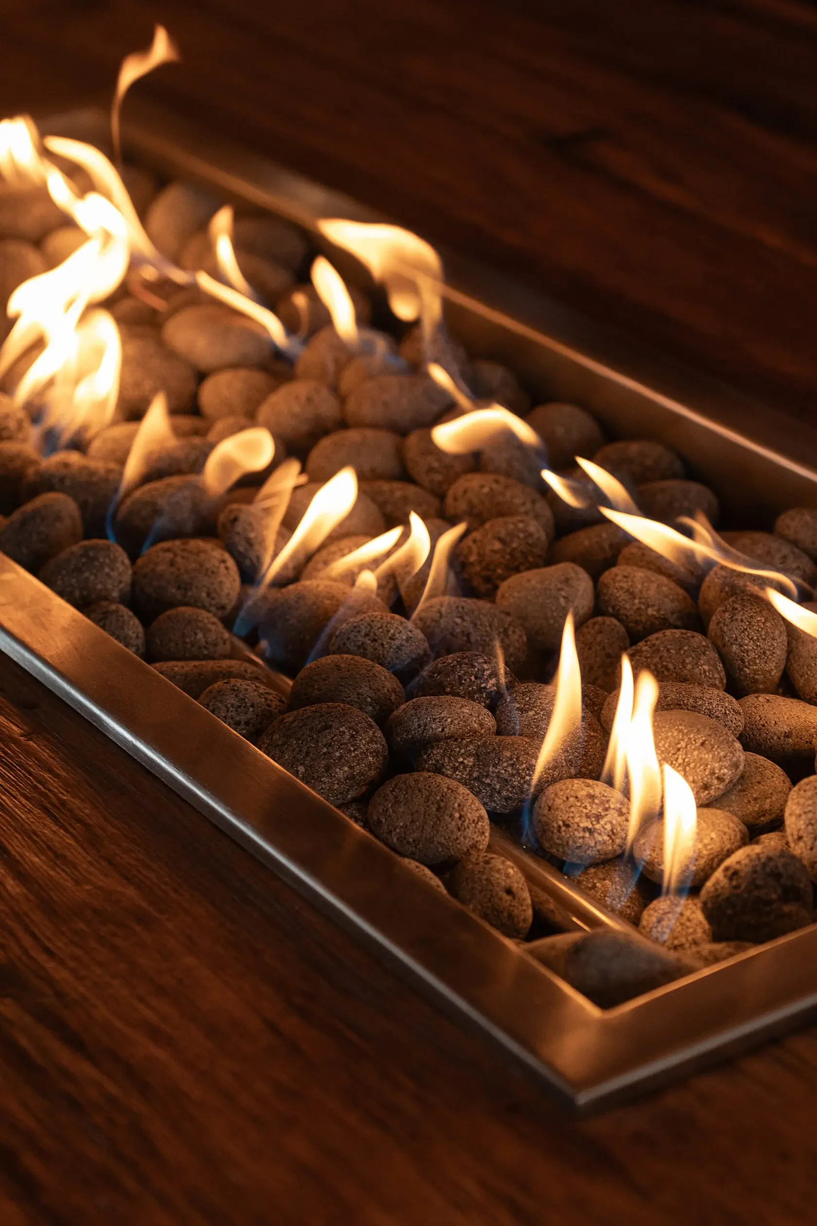 Пористый вулканический камень, созданный для огня отлично аккумулирует и отдаёт тепло, устойчив к резким перепадам температур и открытому пламени, даёт красивую «живую» текстуру вокруг огня.