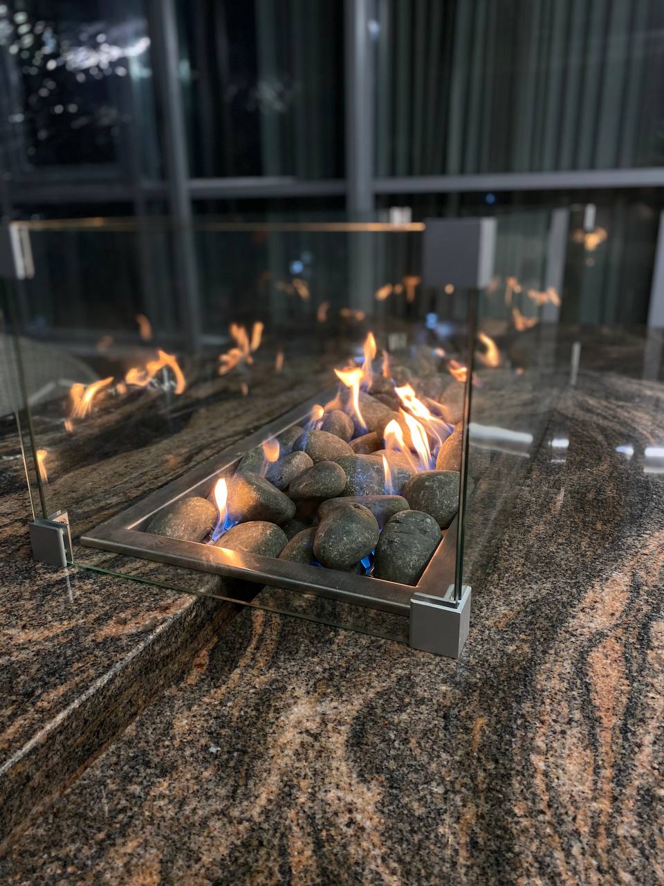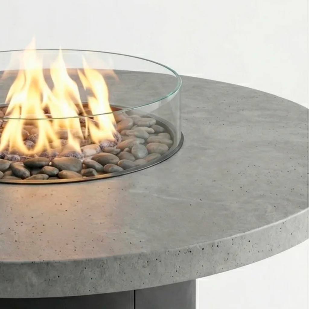 Ветер — главный враг живого огня в гриль столах. Защитное стекло вокруг очага защищает пламя от ветра, создает дополнительный декоративный эффект и защищает от прямого контакта с огнём