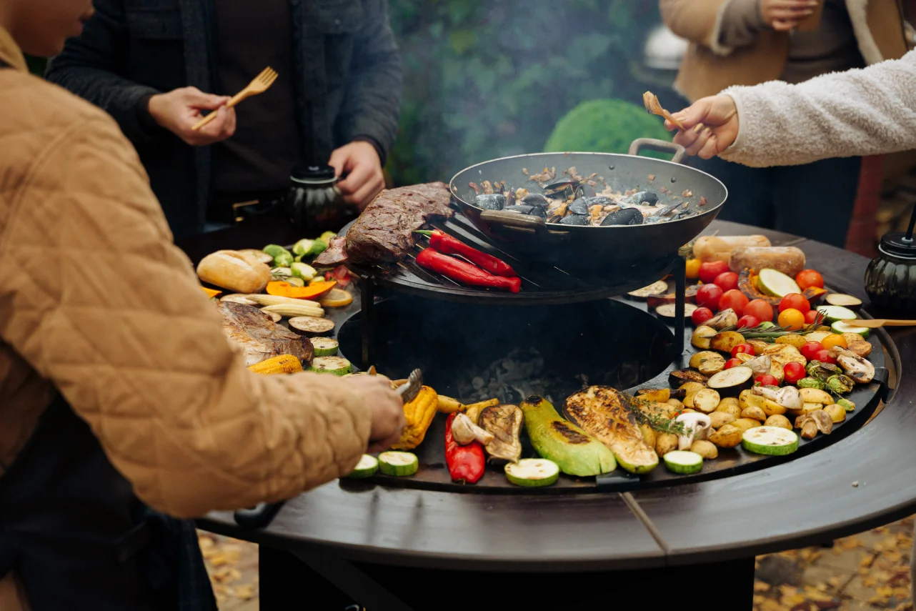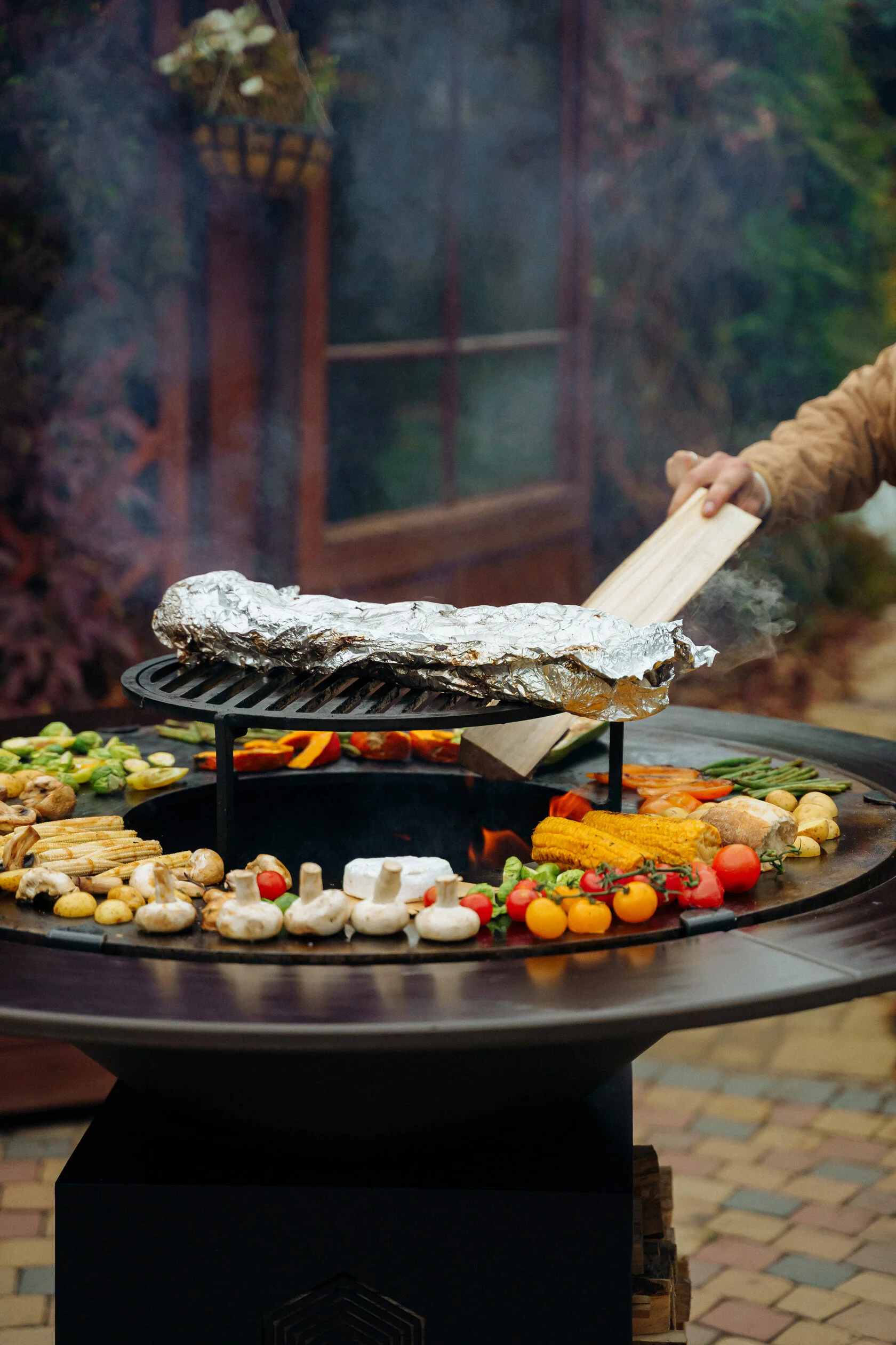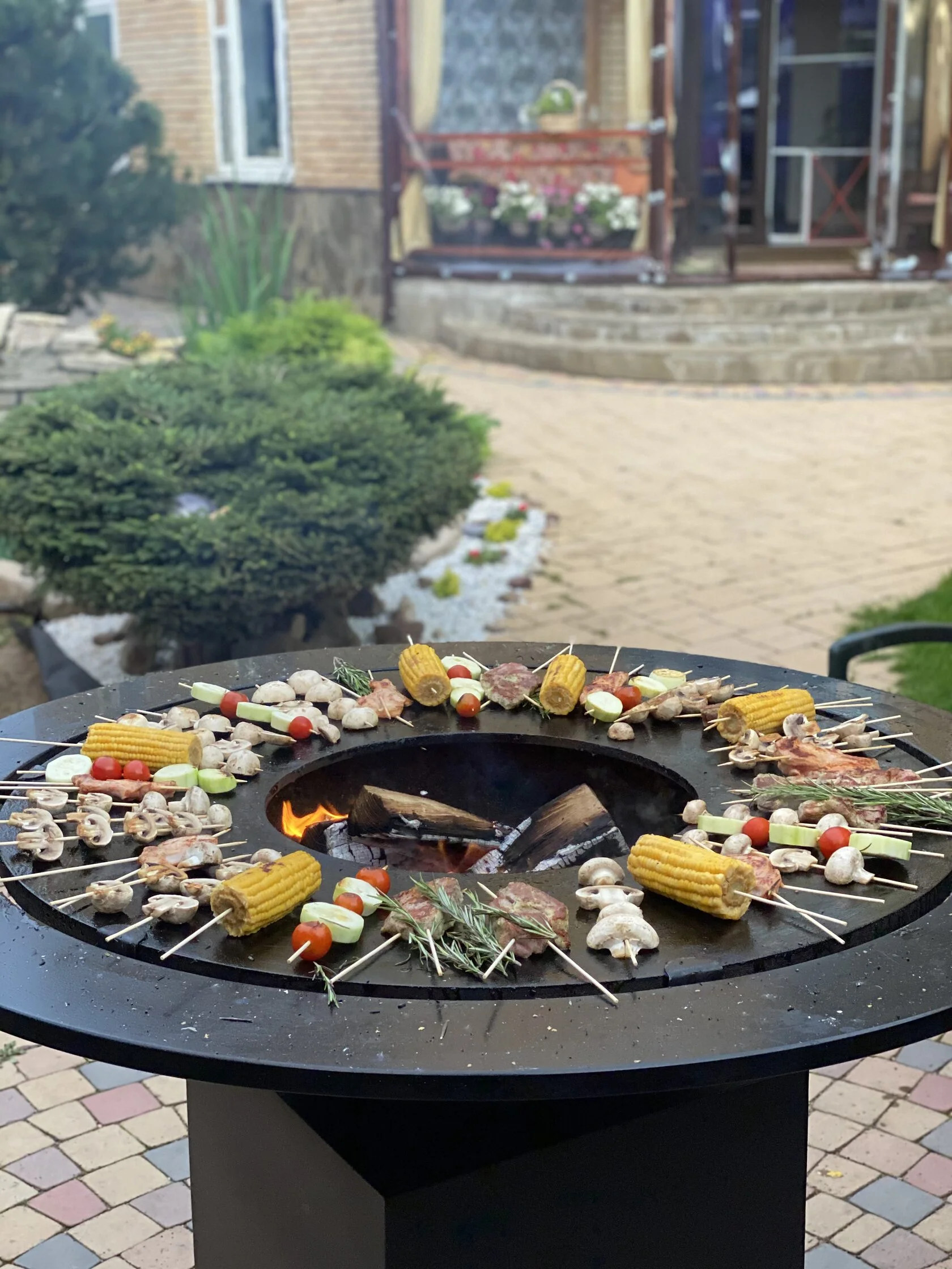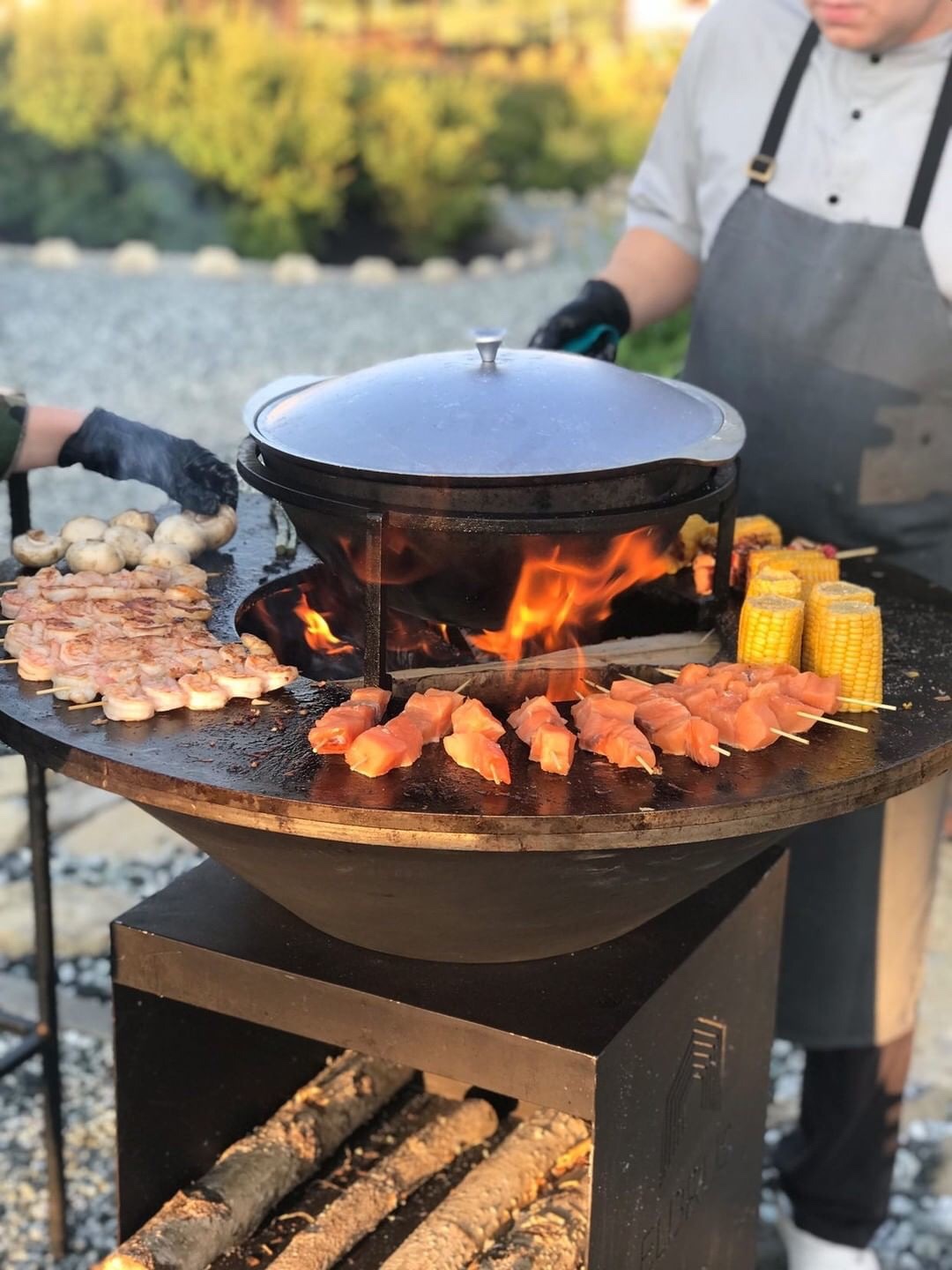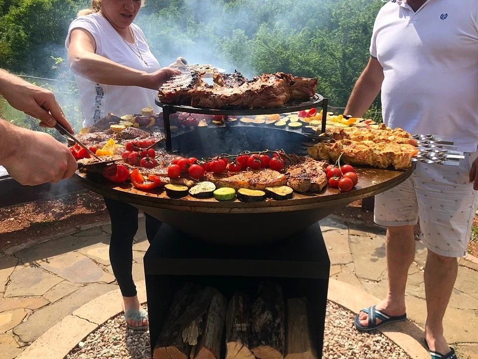Открытый огонь нагревает стальное кольцо, на котором можно одновременно при разной температуре готовить овощи, мясо, птицу, рыбу, морепродукты, супы и соусы, горячие напитки.