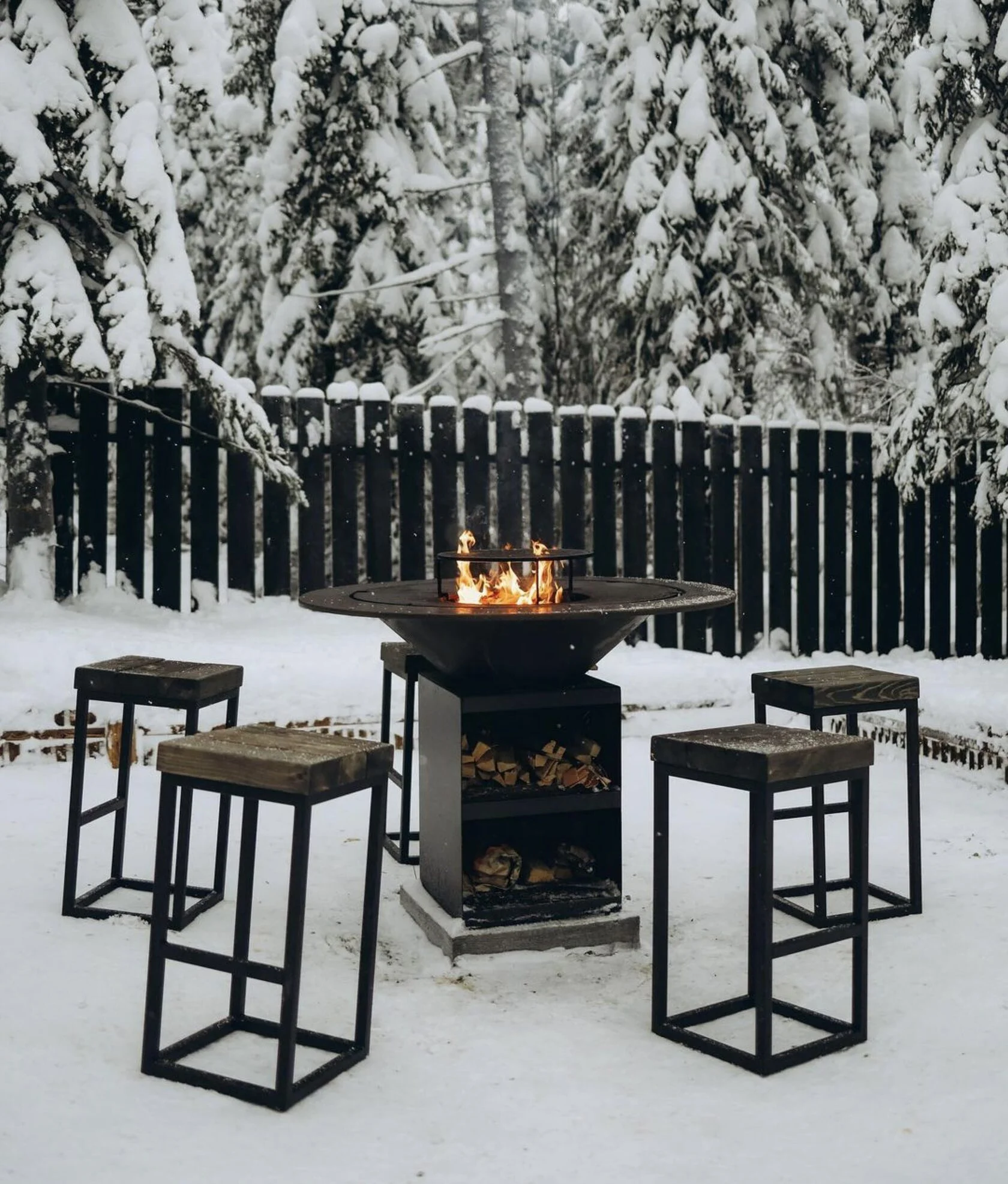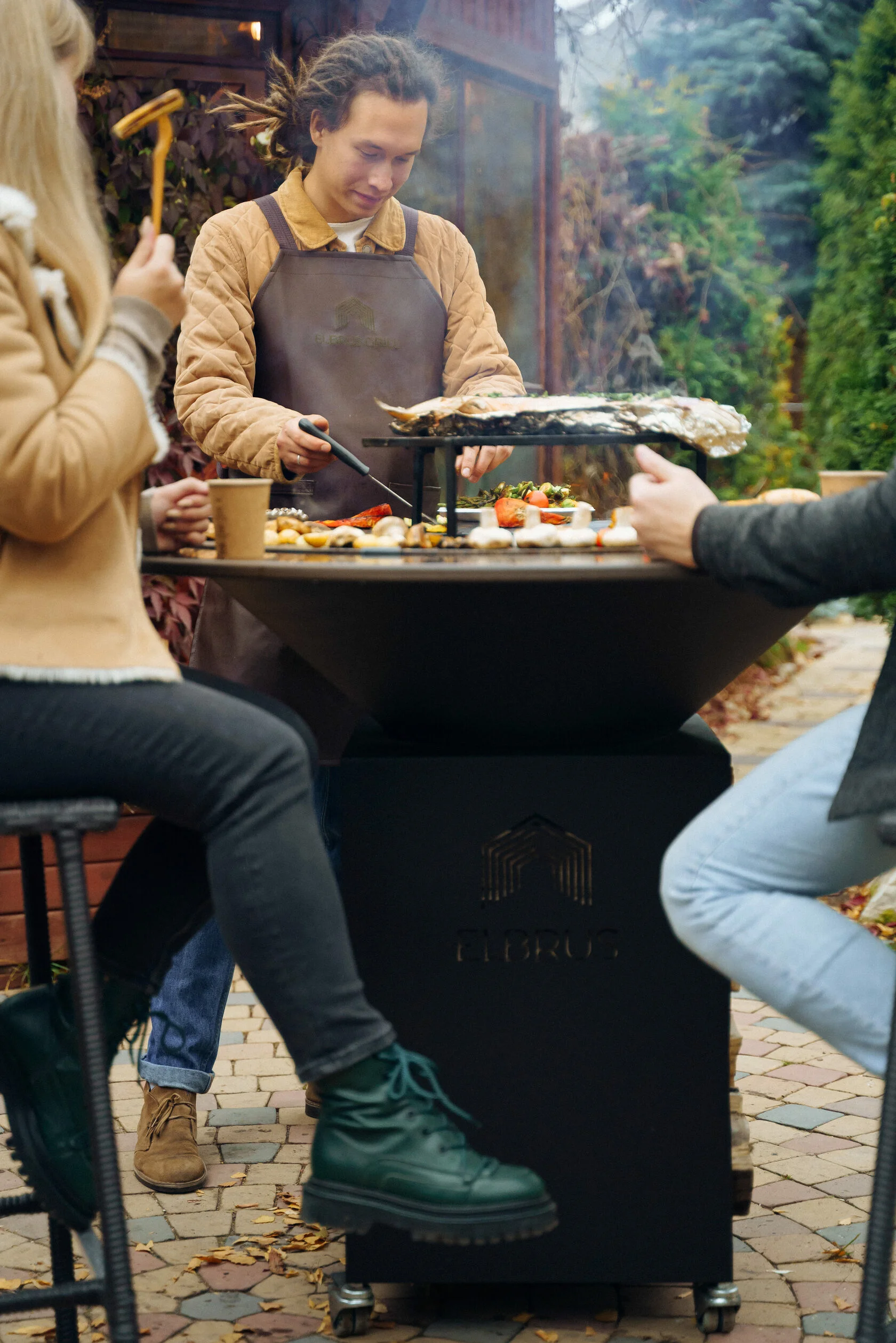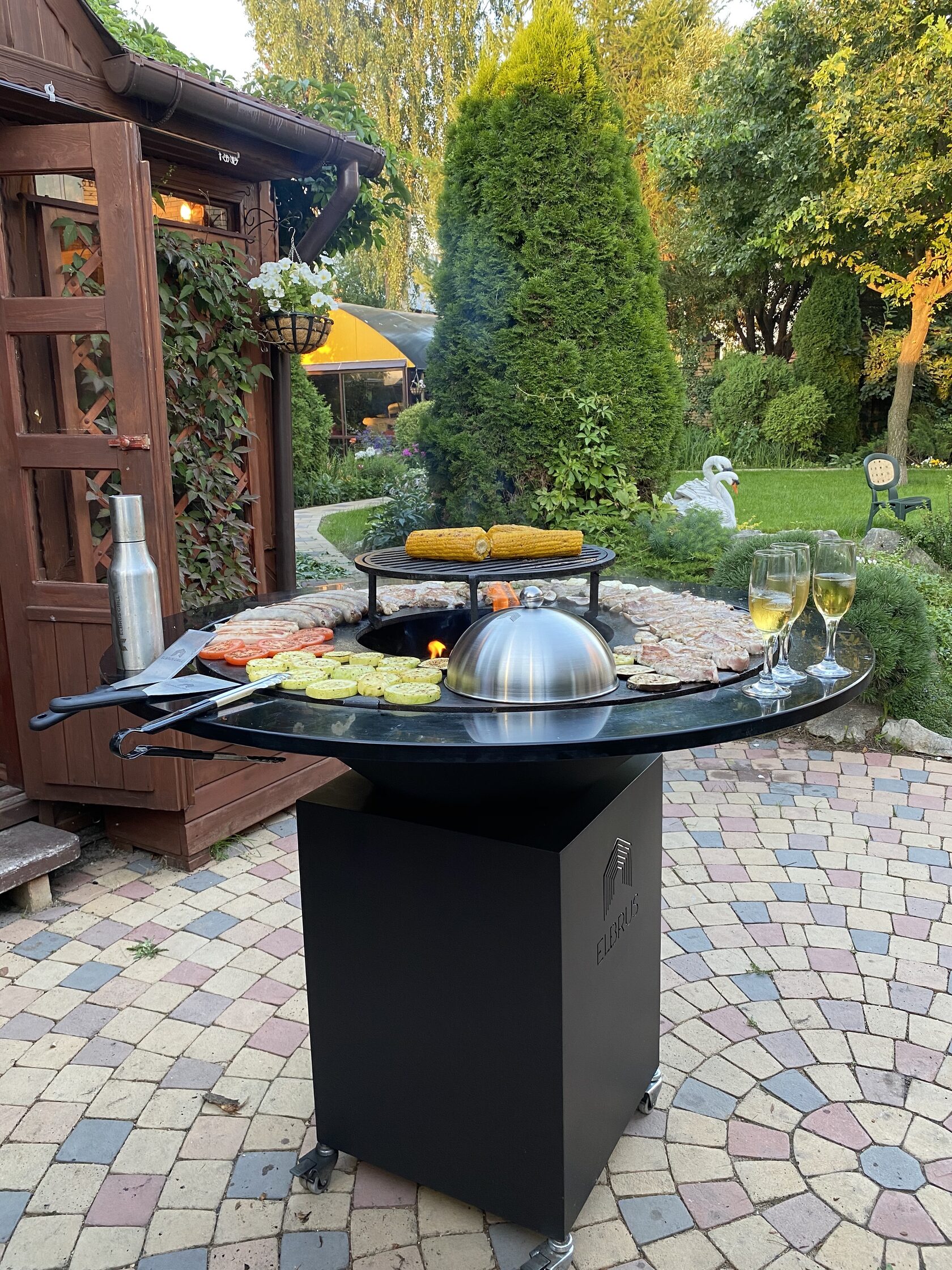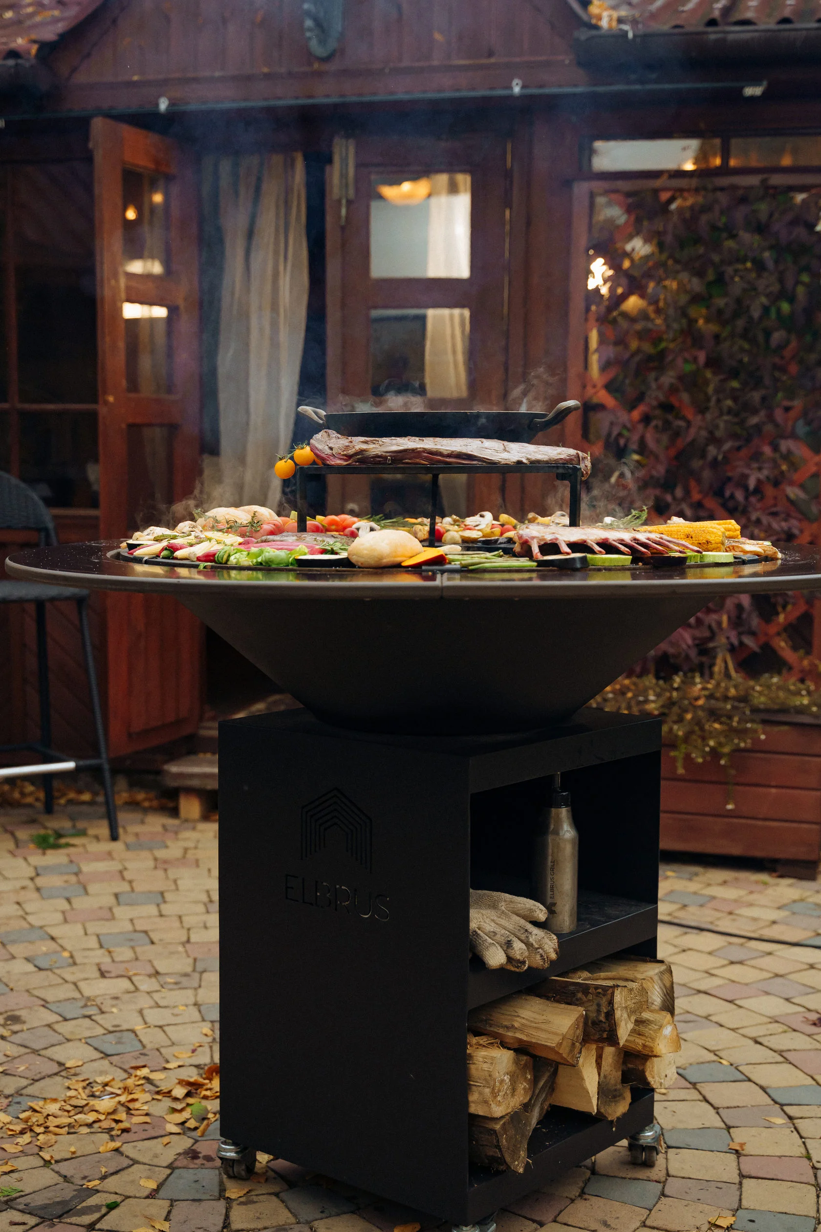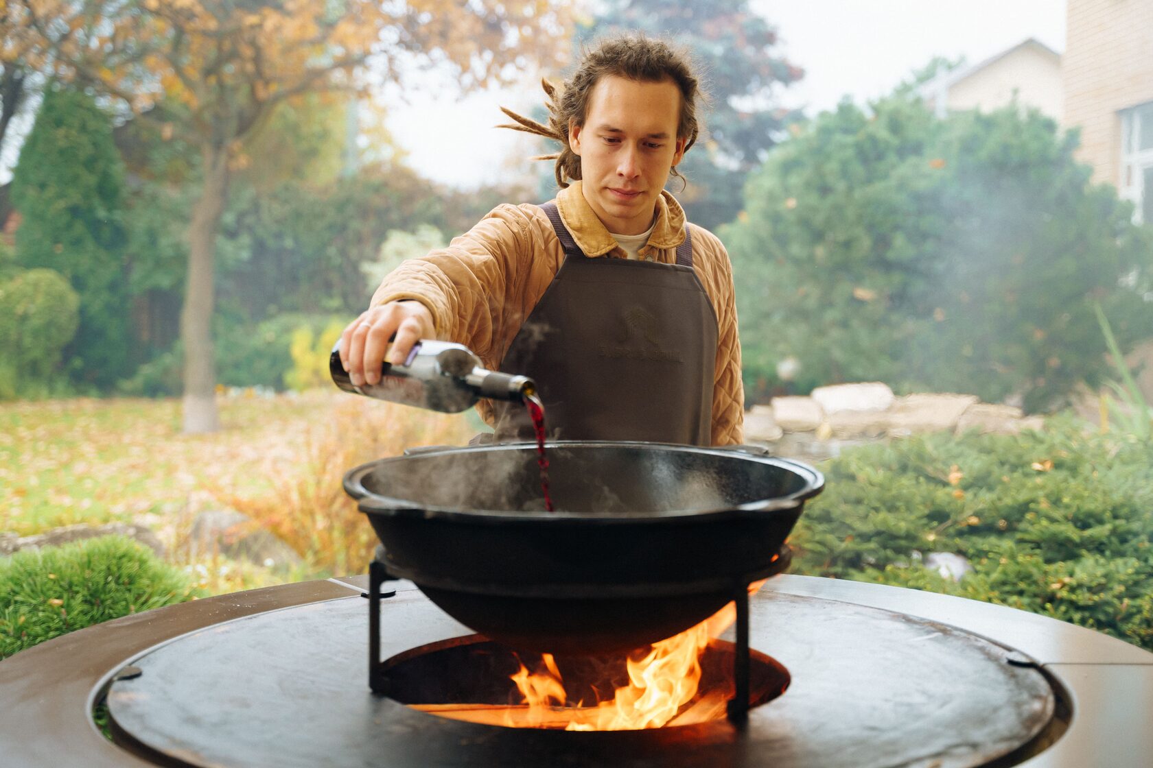 Открытый огонь нагревает стальное кольцо, на котором можно одновременно при разной температуре готовить овощи, мясо, птицу, рыбу, морепродукты, супы и соусы, горячие напитки.