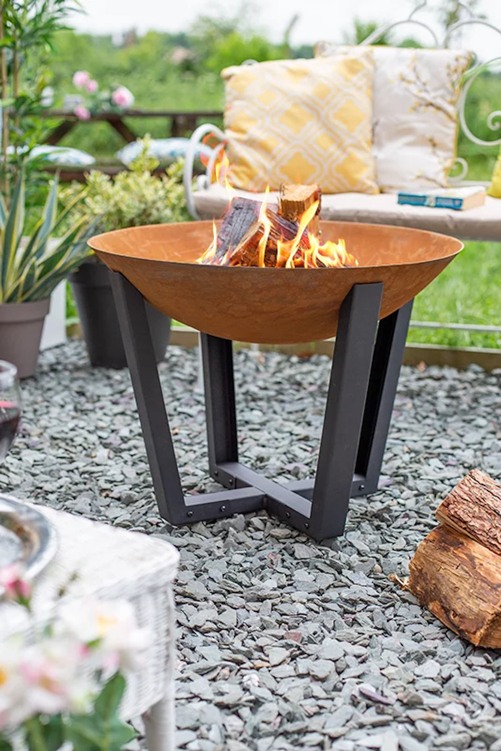 Очаг для костра La Hacienda Icarus M собрал в себе все самое лучшее - лаконичный современный дизайн, прочные материалы и благородные универсальные цвета. Чугунная чаша диаметром 66 см покрыта натуральной ржавчиной благородного золотисто - оранжевого цвета. Металлическая подставка покрыта черной матовой краской. Очаг легко собирать. Размеры: диаметр чаши 66 см, высота очага: 50 см. Вес 13 кг.